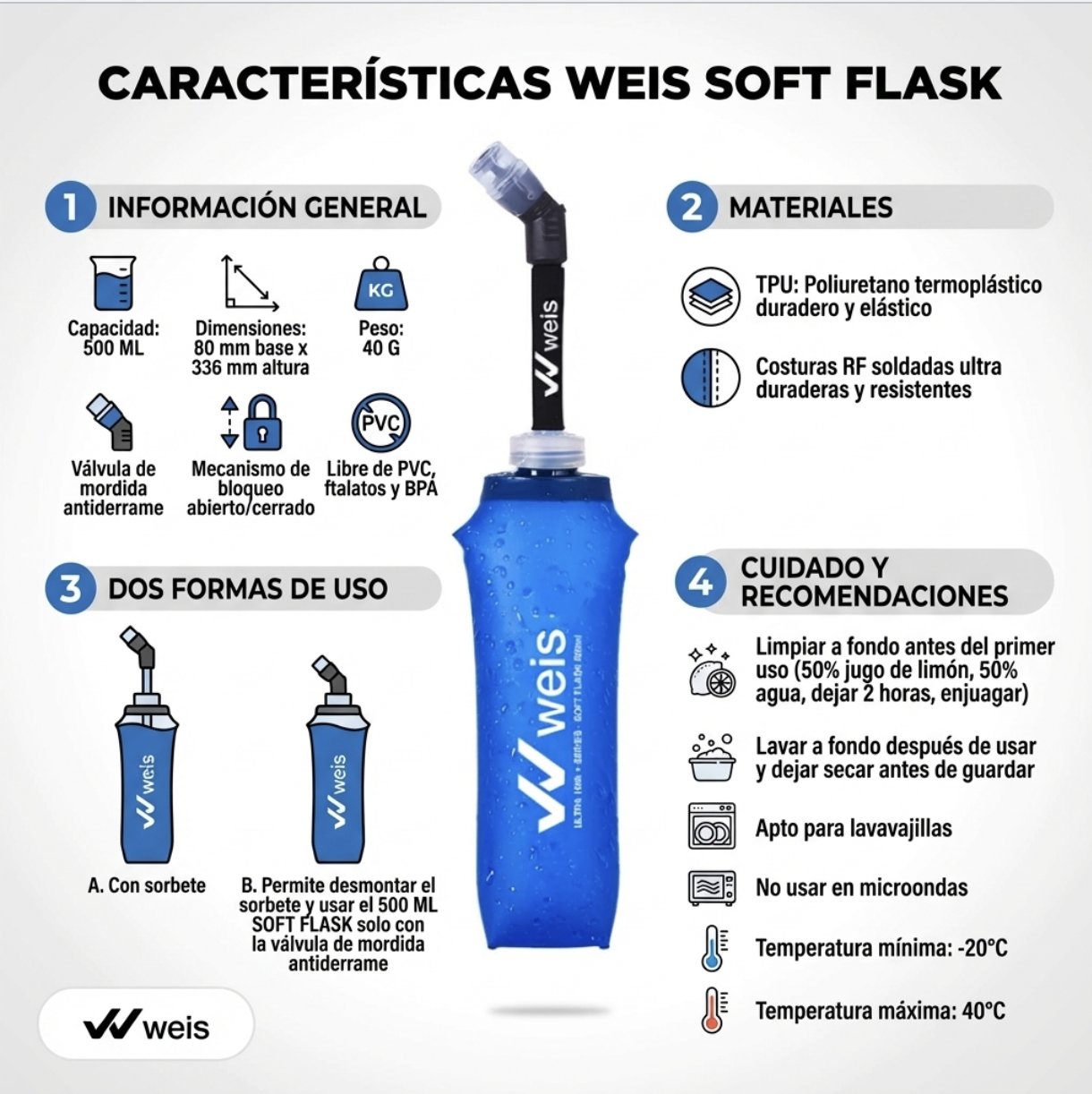 Y si querés simplificar aún más, tenés dos formas de uso: A) con bombilla para beber sin sacarla, o B) desarmás la bombilla y la usás solo con la válvula de mordida.
