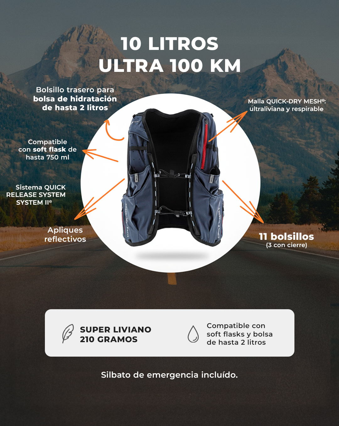 El chaleco de running Simmer II 10L está pensado para atletas exigentes y corredores de largas distancias. Con la tecnología FREELASTIC TECH®, se adapta al cuerpo como una segunda piel y acompaña cada movimiento sin rebotes. Su diseño expandible suma 3 litros extra al modelo Simer 7L, manteniendo el mismo acceso rápido a bolsillos y compartimentos.