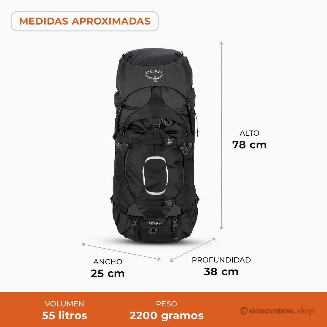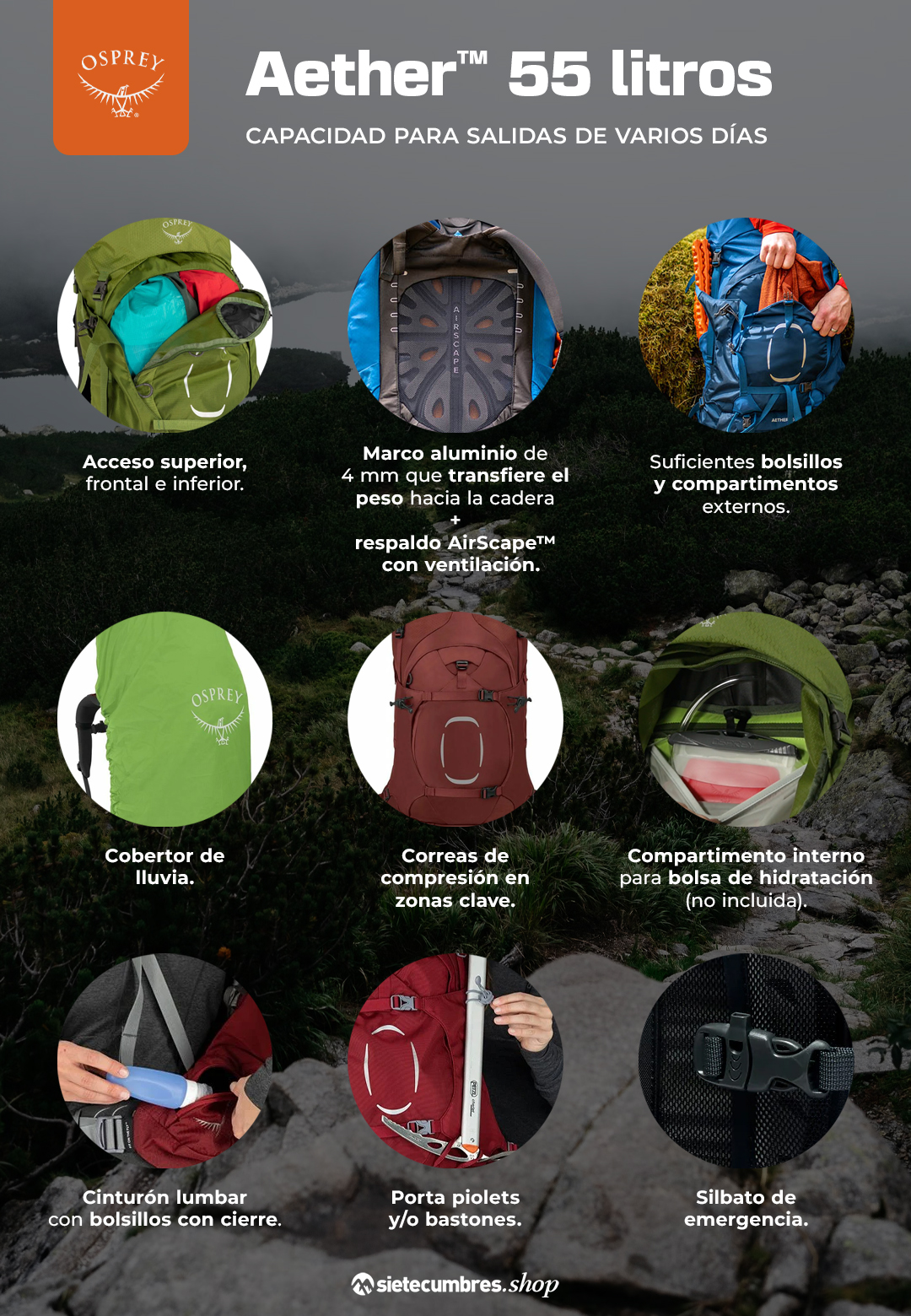 La Osprey Aether 55 es una mochila de trekking diseñada para travesías largas y exigentes, cuando necesitás cargar bastante peso y mantenerlo estable en terrenos técnicos. Ganadora del Backpacker Editors’ Choice Gold Award, combina ajuste personalizado, suspensión ventilada y materiales resistentes con certificación sostenible. Incluye funda para lluvia y múltiples accesos que hacen más simple organizar y alcanzar tu equipo.