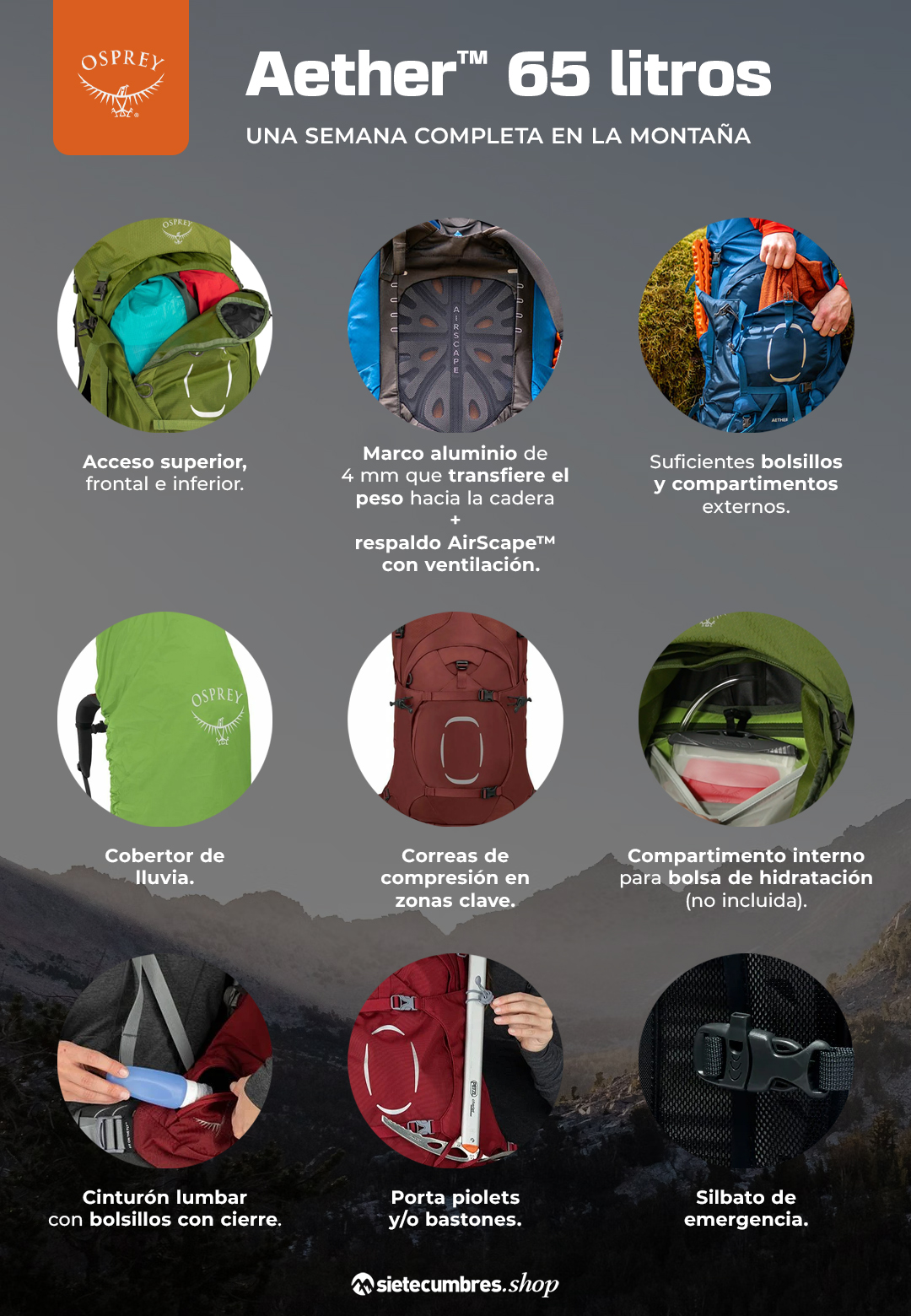 La mochila Osprey Aether 65 está pensada para salidas largas, desde un fin de semana cargado hasta una semana completa en la montaña. Su diseño combina capacidad, comodidad y ajuste personalizado, logrando un porteo estable incluso con cargas pesadas. Con sistema de ajuste Custom Fit-on-the-Fly™ y respaldo AirScape™, es una mochila de trekking robusta y confiable para quienes buscan rendimiento y confort en travesías exigentes.