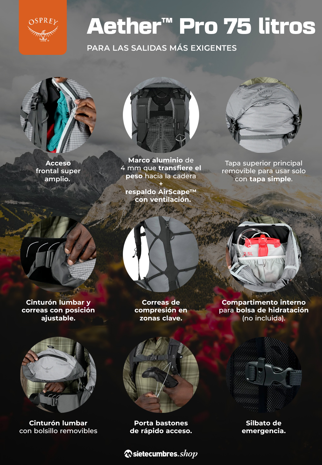 La Osprey Aether Pro 75 es una mochila técnica pensada para profesionales, guías de montaña y aventureros que necesitan capacidad, resistencia y confort en entornos extremos. Su diseño combina materiales ultrarresistentes con un sistema de suspensión ajustable y liviano que te permite cargar peso sin perder agilidad. Ideal para travesías largas, alta montaña o expediciones donde la fiabilidad del equipo no se negocia.
