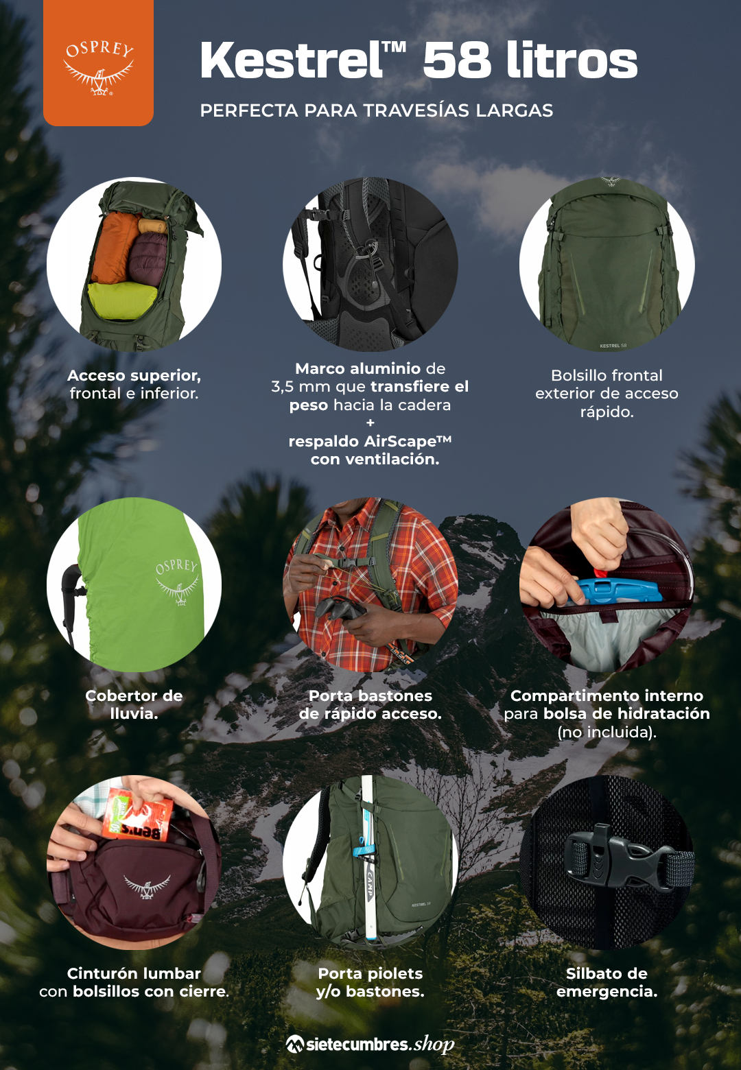 La Osprey Kestrel™ 58 litros está pensada para los que se mueven en serio por la montaña. Diseñada para soportar jornadas intensas de senderismo, travesías y campamentos de varios días, combina gran capacidad, resistencia y comodidad. Su diseño robusto y funcional la hace ideal tanto para aventuras exigentes en la naturaleza como para expediciones de varios días donde necesitás llevar todo tu equipo bien organizado.