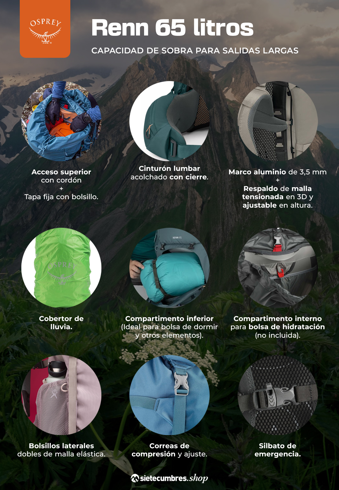 La Osprey Renn 65L es una mochila de trekking diseñada especialmente para quienes que buscan comodidad y practicidad. Con capacidad de sobra para salidas largas y un sistema de ajuste simple e intuitivo, esta mochila de 65 litros es ideal para aventureras que quieren recorrer varios días con todo lo necesario sin complicaciones.
