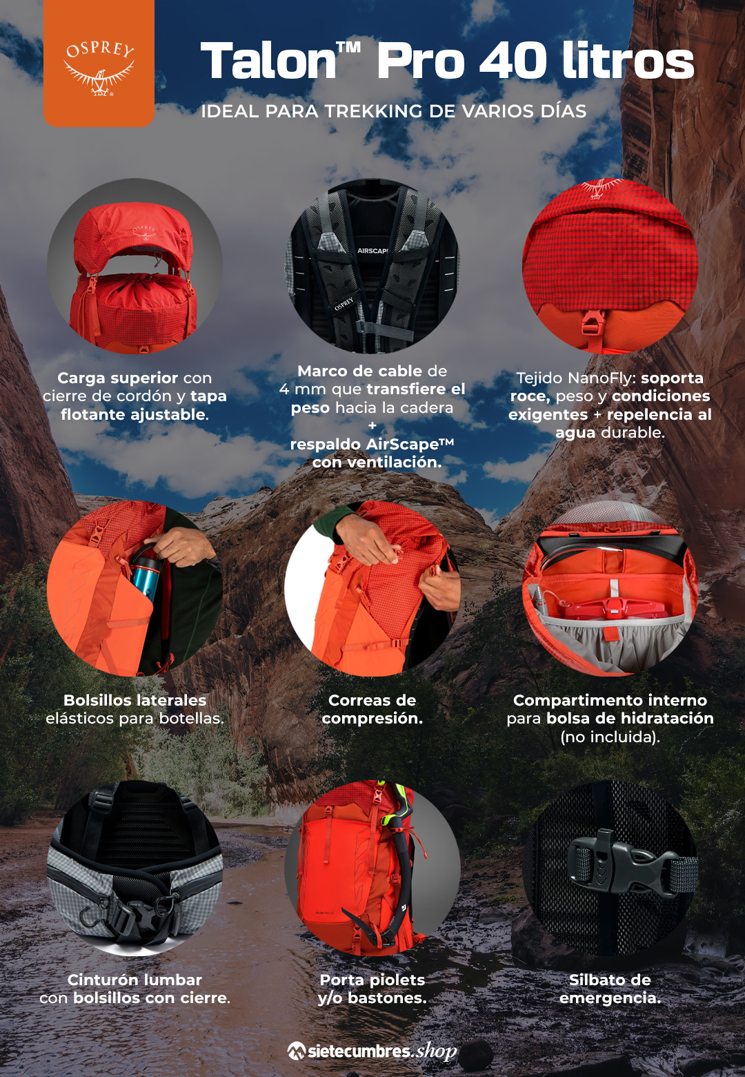 La mochila técnica Osprey Talon Pro 40 es una compañera todo terreno: liviana, resistente y pensada para quienes necesitan rendimiento real en montaña, escalada o travesías de varios días. Con ajuste de torso mejorado, armazón inyectado de alta precisión y el exclusivo tejido NanoFly™ ultrarresistente, es una mochila que combina velocidad, durabilidad y comodidad en un diseño premium.