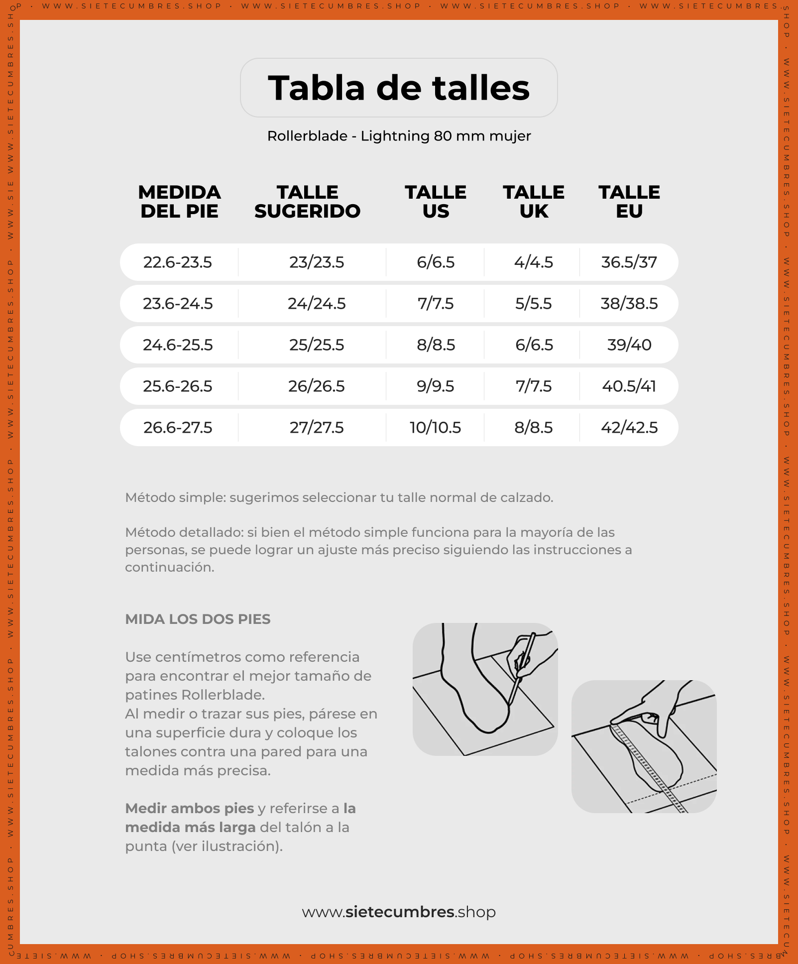 El Lightning W combina una bota moldeada con ventilación (para soporte y mejor transferencia) con un andar súper equilibrado gracias al frame de aluminio de 243 mm, ruedas Urban 80 mm / 85A y rodamientos SG7. Y para que el calce te quede como a vos te gusta, suma el Footboard Sizer: más ajustado y “performance”, o más relajado y cómodo.