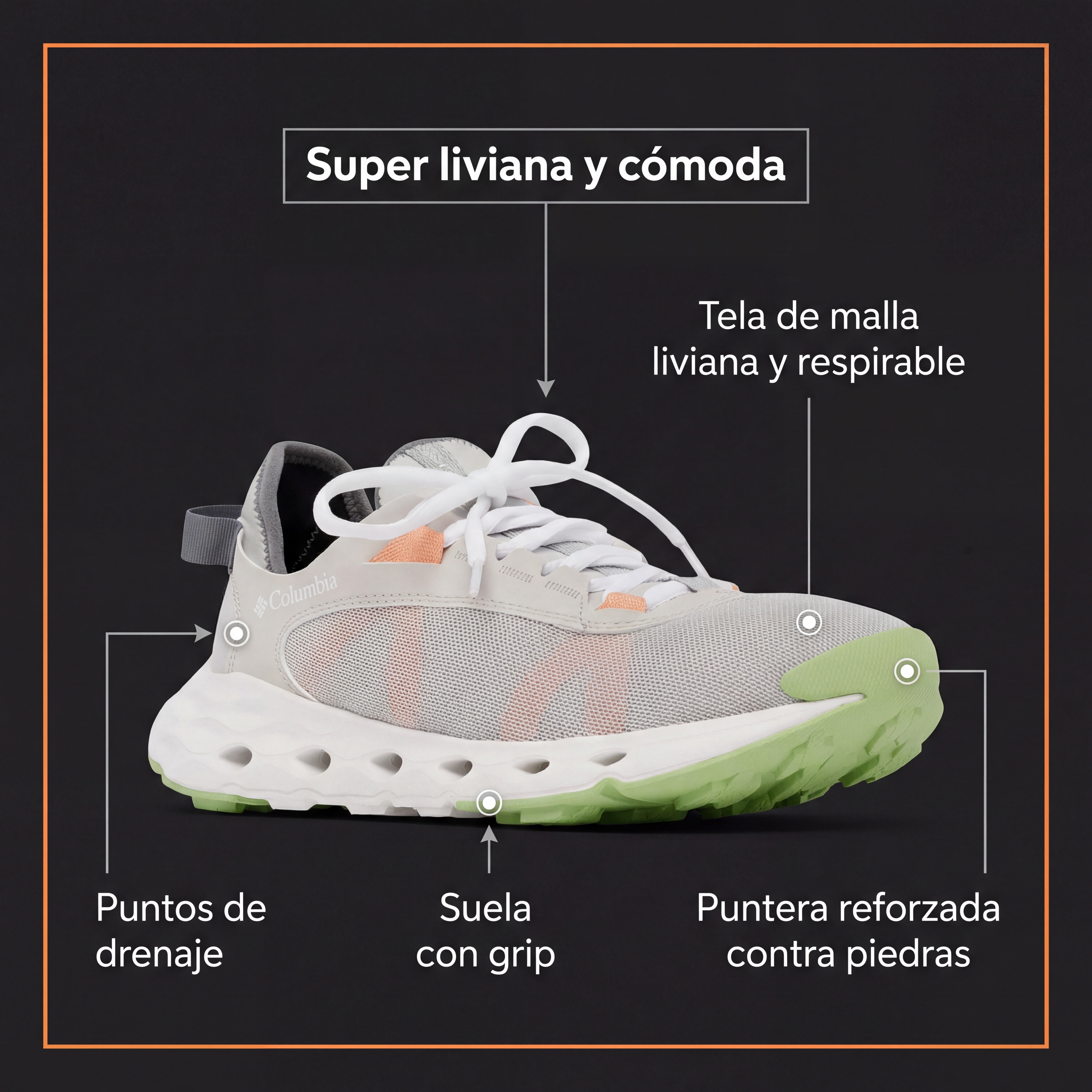 Puertos de drenaje en la mediasuela Omni-Grip™ LT + upper ventilado de malla. El agua sale rápido y el calzado no se vuelve una “bolsa” cargada. Resultado: más livianas al rato y mucho más cómodas para seguir en movimiento.